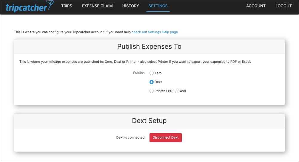 Once Authorised by Dext, you will be taken back to Tripcatcher with the connection completed. You are now ready to publish your mileage to Dext.