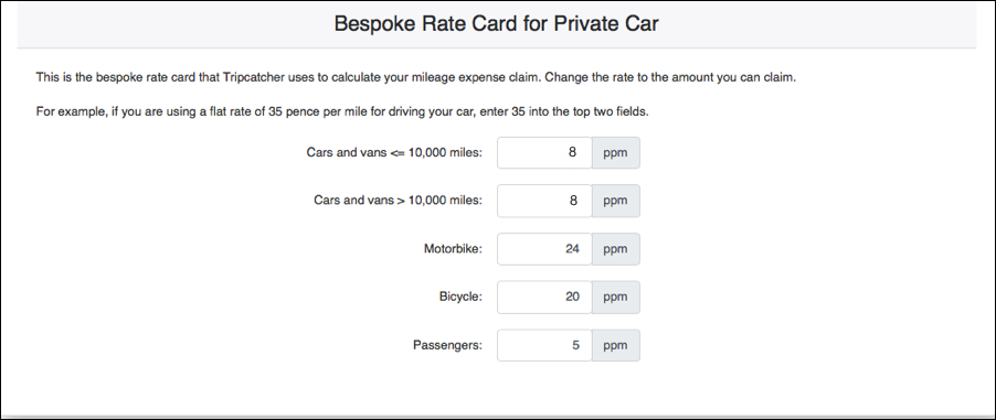 When using Bespoke rates you will need to enter the actual rate into the Rate Card table. Ensure you enter both the under 10,000 miles rate as well as the over 10,000 rate. Otherwise, Tripcatcher will use the default rate for the mileage over 10,000 miles which is 25ppm.
